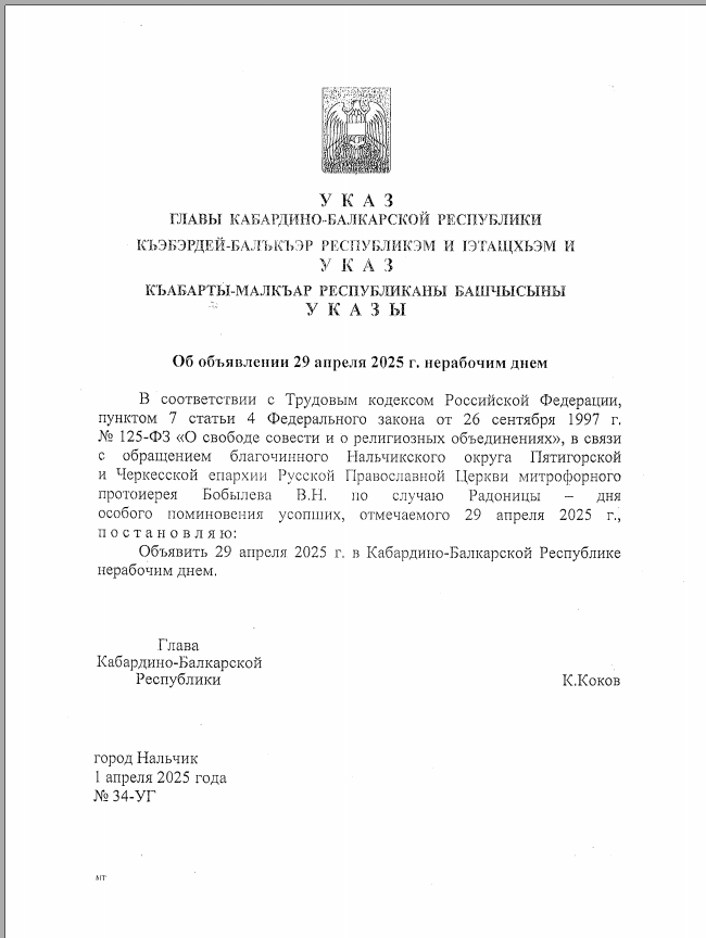 29 апреля 2025 года в Кабардино-Балкарской Республике объявлен выходным днем