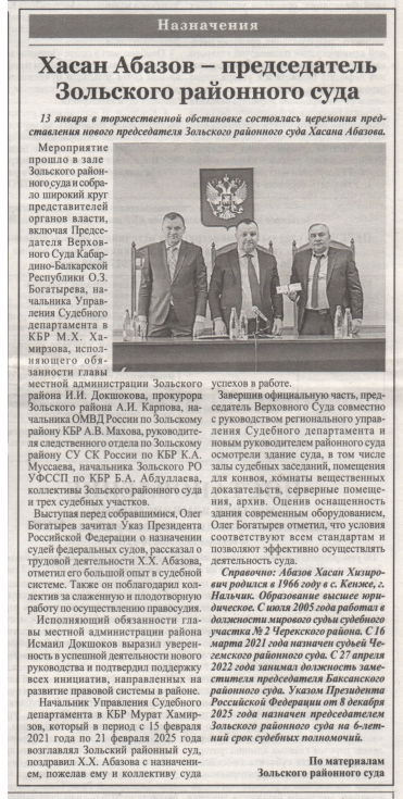 | В районной газете "Зольские вести" опубликована статья, посвященная представлению председателя суда | версия для печати |